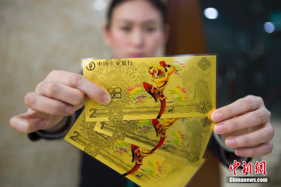 随着猴年即将来临,各种与猴有关的黄金制品也开始登场。1月4日,山西一银行工作人员展示由黄金制成的“齐天大圣”金钞。 张云 摄