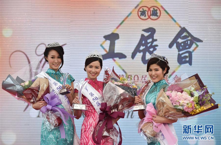 1月4日,香港第50届工展会小姐冠军得主黎雪莹(中)、亚军张翠茵(右)和季军冯凯懿在颁奖典礼上合影。当日,香港第50届工展会闭幕,并举行工展会小姐颁奖典礼。不少参展商在最后一日降价促销,吸引大批顾客前往购买。 新华社发(伍永健 摄)