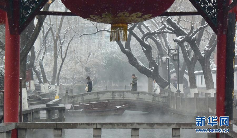 1月6日拍摄的济南历下区街头一处泉水。1月6日,山东济南市区出现降雪天气。济南各大泉池周围形成了云蒸雾绕的景观,美景让人流连忘返。 新华社记者 徐速绘 摄
