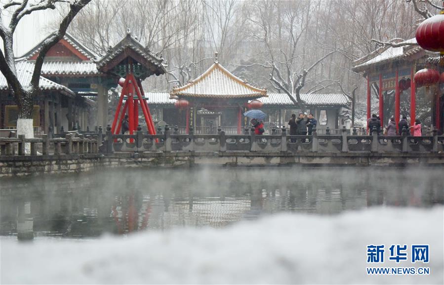 1月6日拍摄的济南趵突泉。1月6日,山东济南市区出现降雪天气。济南各大泉池周围形成了云蒸雾绕的景观,美景让人流连忘返。 新华社记者 徐速绘 摄