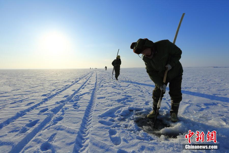 据悉,2016年乌伦古湖冬捕旅游文化活动也将于1月16日—1月18日开幕,疆内外的游客将在乌伦古湖感受冬捕渔猎文化和冰雪文化,以及浓郁的哈萨克族传统文化。 图为渔民们正在“走钩”。 庄晓颇 摄