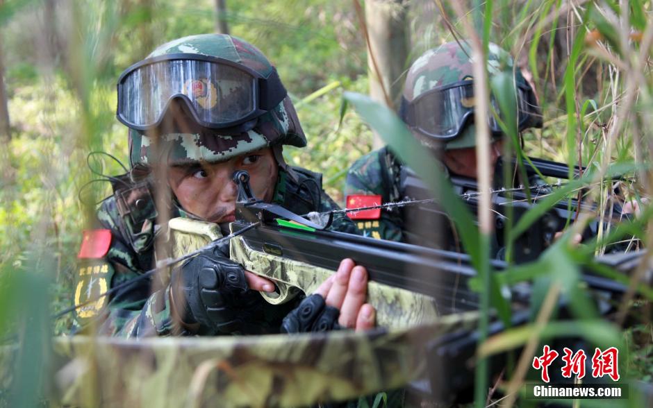 1月6日消息,新年伊始,武警广西总队南宁市支队掀起强军练兵的热潮,把练技术与练作风、练战术与练思想有机结合起来,鼓舞士气砺练“血性”。图为武警特战队员在进行丛林搜索训练。 王俞 摄