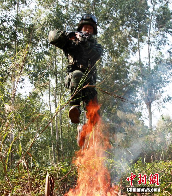1月6日消息,新年伊始,武警广西总队南宁市支队掀起强军练兵的热潮,把练技术与练作风、练战术与练思想有机结合起来,鼓舞士气砺练“血性”。图为一名武警特战队员在飞跃“火海” 。 王俞 摄