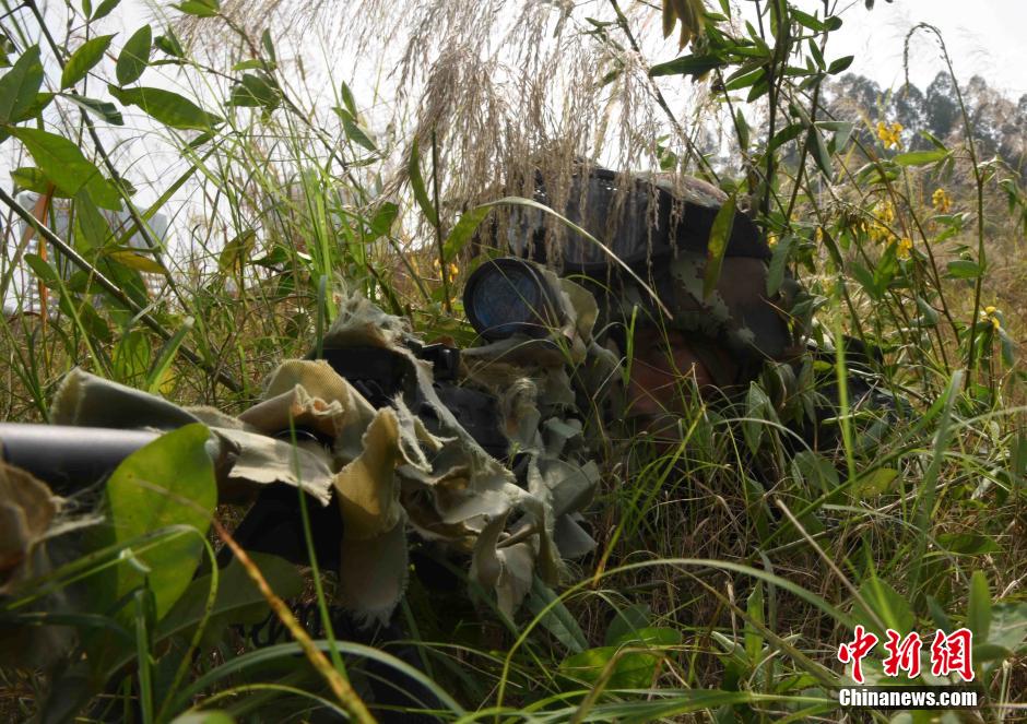 1月6日消息,新年伊始,武警广西总队南宁市支队掀起强军练兵的热潮,把练技术与练作风、练战术与练思想有机结合起来,鼓舞士气砺练“血性”。图为一名武警特战狙击手在伪装狙击训练。 王俞 摄