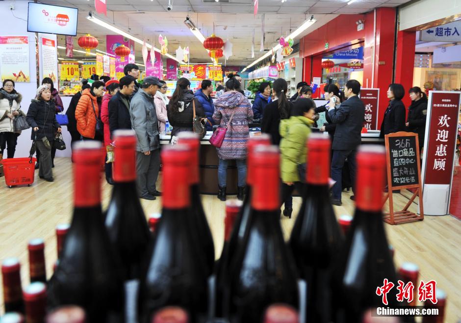 1月6日,石家庄保税店正式开业,市民足不出户即可买到来自美国、英国、澳大利亚、新西兰、韩国、日本、南美等地的食品、日用品、化妆品等多种国外商品。据了解,该市首批体验店有两家,店内汇集80多个国家的进口商品,涵盖了3000多个品牌,5万多种商品。体验店内商品直接从原产地采购,保证商品质量和产地特色。由于减少了中间环节,商品价格与市场上的进口商品相比可便宜10%至30%。图为源源不断的市民进店选购。 中新社记者 翟羽佳 摄