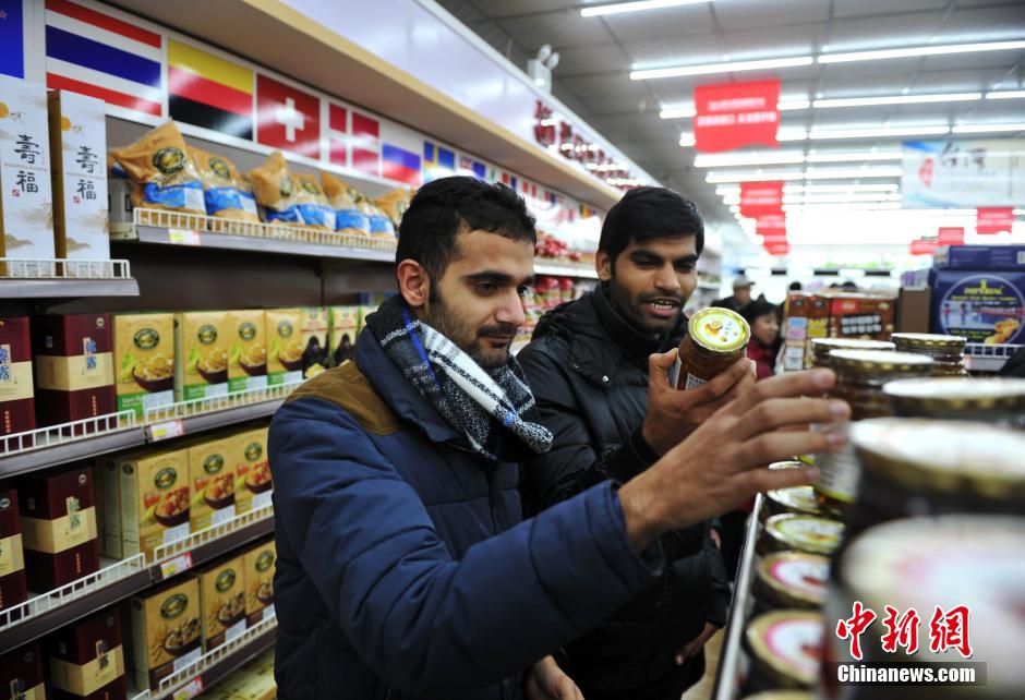 1月6日,石家庄保税店正式开业,市民足不出户即可买到来自美国、英国、澳大利亚、新西兰、韩国、日本、南美等地的食品、日用品、化妆品等多种国外商品。据了解,该市首批体验店有两家,店内汇集80多个国家的进口商品,涵盖了3000多个品牌,5万多种商品。体验店内商品直接从原产地采购,保证商品质量和产地特色。由于减少了中间环节,商品价格与市场上的进口商品相比可便宜10%至30%。图为外国留学生进店选购。 中新社记者 翟羽佳 摄