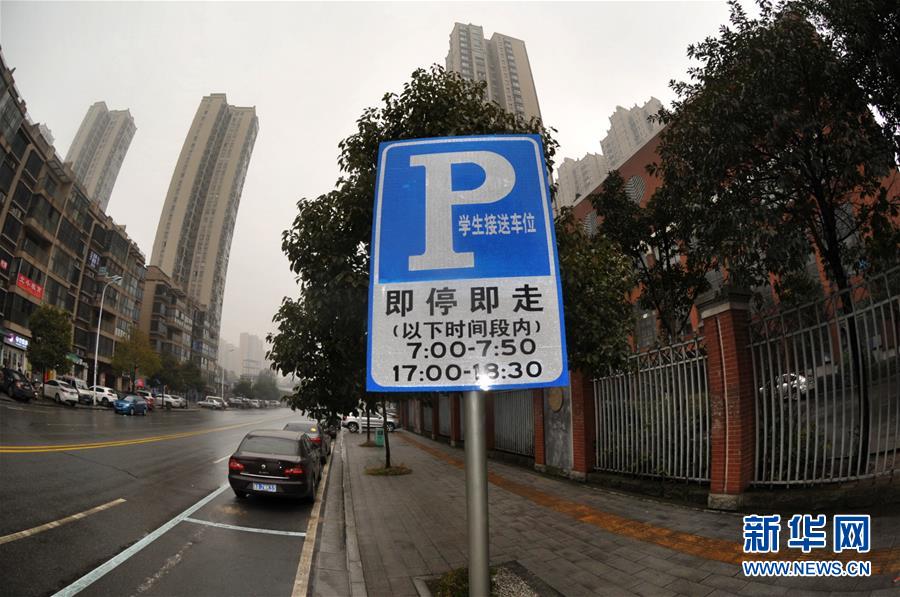 新华社照片,长沙,2016年1月11日 中小学学生接送车位亮相长沙长沙城区一中学周边一处新设置的学生接送专用“蓝色车位”(1月11日摄)。近日,为加强道路交通管理,规范学生接送车辆行停秩序,并方便家长接送孩子,长沙交警部门在城区40余所中小学周边新设置学生接送专用车位。据介绍,此次集中设置的学生接送即停即走停车位按照国标设置,地面停车位施划蓝色实线,表示免费停车。道路右侧设置学生接送车位停车标志,下设辅标标明“即停即走”及准停时段。长沙交警将严格校园周边交通秩序管控,加大执法力度,对不按规定停放的车辆依法处罚。新华社记者 龙弘涛 摄