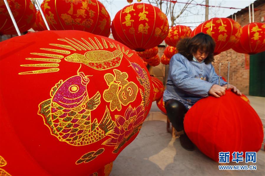 随着农历猴年春节的临近,河南省焦作市武陟县出产的灯笼日益俏销,当地村民加紧赶制大红灯笼,供应节日市场。地处豫北的武陟县西陶镇石荆村有着制作红灯笼的传统,近年来,这项技艺成为当地农民增收的一条重要渠道。新华社记者 李博 摄