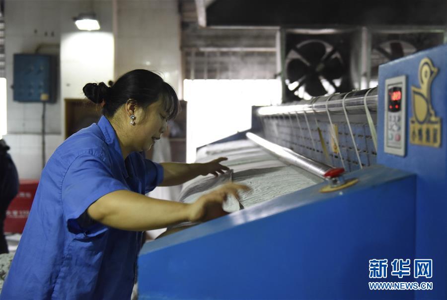 1月12日,一名穿短袖的工人们在洗涤车间内工作。进入三九天,也就到了一年中最冷的时候,在成都铁路局成都客运段整备一车间的洗涤车间,这里却有近四十摄氏度的高温。该车间承担了成都客运段全部列车的卧具洗涤工作,每天清洗大约两万多件卧具,机器24小时不停地运转,水蒸气将这里变成了寒天里的“温室”。据车间负责人介绍,随着春运即将到来,洗涤车间已增加工人,为完成春运任务提供后勤保障。 新华社记者 刘坤 摄
