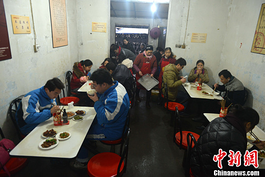 1月12日,成都“叁无”粉蒸餐馆吸引食客。“叁无”餐馆环境极其简陋,最便宜的一道菜仅有两元人民币,因其“无门牌”、“无招牌”、“无服务”得名,在新评出的成都“十大苍蝇馆子”,“叁无”排名第一。中新社记者 张浪 摄