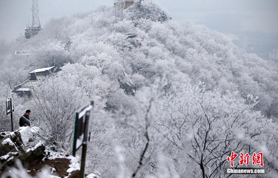 1月12日,市民在南京紫金山头陀岭欣赏雪景。当日,南京地区迎来新年首场雪。据中国中央气象台发布的预报显示,未来两天,西北地区东部、黄淮中西部、江汉中北部、江淮等地将相继出现雪或雨夹雪天气。泱波 摄