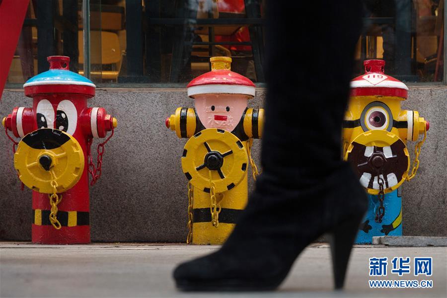 这是1月13日拍摄的南京新街口的“萌萌哒”消防栓。近日,南京新街口街头的消防栓经过装饰后变身卡通形象,“萌萌哒”的模样吸引了过往行人的目光。 新华社发(苏阳 摄)