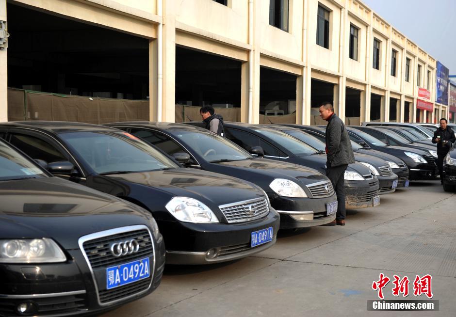 1月14日,湖北省省直机关公务用车改革处置车辆专场拍卖会第八场在武汉绅宝二手车市场举办。当日154台公车全部成功拍卖,成交总价825.3万元。至此,湖北已成功拍出1050辆公车。图为拍卖会现场举牌竞价。中新社记者 张畅 摄
