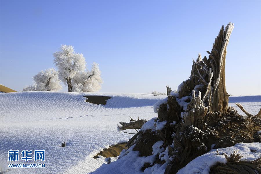 1月14日,“死亡之海”塔克拉玛干沙漠中,胡杨身披雪白晶莹的雾凇。从2015年年底以来,有“死亡之海”之称的新疆塔克拉玛干沙漠频现雾凇奇观,黄沙映着晶莹的雾凇,把“死亡之海”北部装扮成一个璀璨迷离的童话世界。新华社发(刘伟摄)