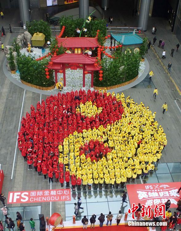 1月20日,千名“萌友”拼出太极图。当日,“英雄归来邀你共萌”启动仪式在成都举行,耍宝卖萌的神龙大侠阿宝携好友美美衣锦还乡,与好莱坞明星哈德森、动画大师许诚毅一起在成都春熙路街头和“萌友”合力完成“千人太极拼图”,引得现场粉丝尖叫声不断。中新社记者 刘忠俊 摄