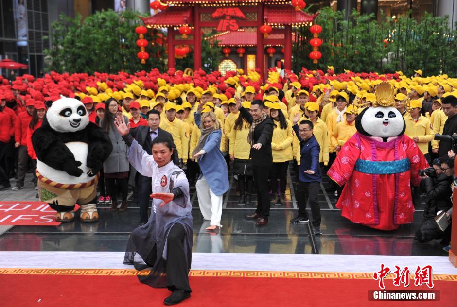 1月20日,神龙大侠阿宝和美美、哈德森、许诚毅等人成都街头学太极。当日,“英雄归来邀你共萌”启动仪式在成都举行,耍宝卖萌的神龙大侠阿宝携好友美美衣锦还乡,与好莱坞明星哈德森、动画大师许诚毅一起在成都春熙路街头和“萌友”合力完成“千人太极拼图”,引得现场粉丝尖叫声不断。中新社记者 刘忠俊 摄