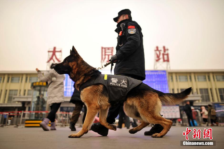 1月20日,山西太原火车站站前广场,车站派出所警察携警犬武装巡逻。2016年中国铁路春运将于1月24日开启,太原铁路警方为此提升安保等级,加大巡控力度。中新社记者 韦亮 摄