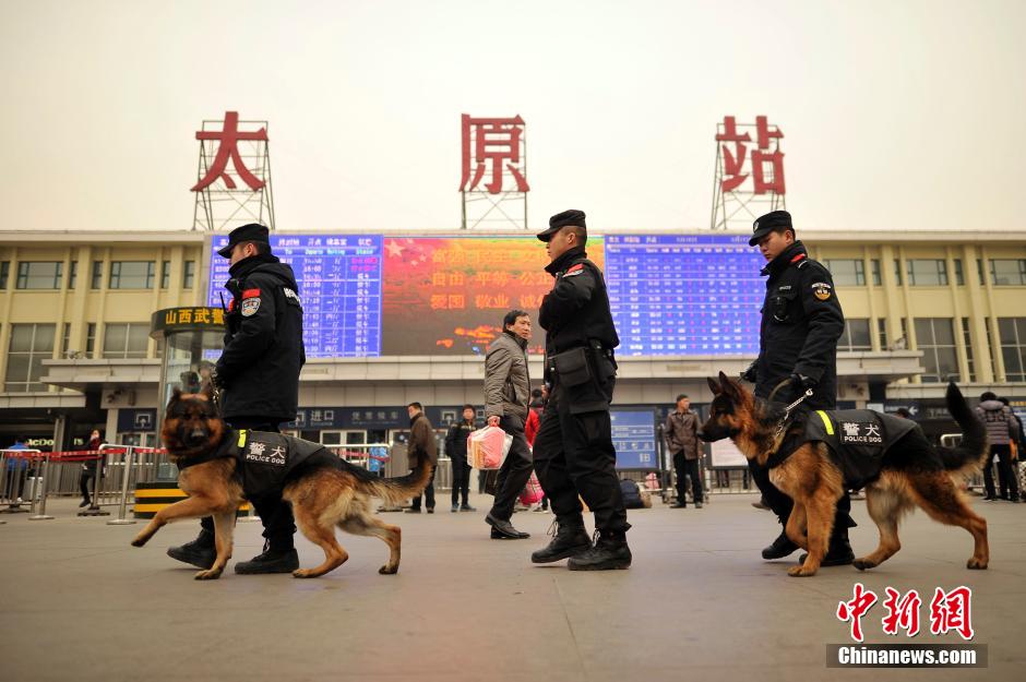 1月20日,山西太原火车站站前广场,车站派出所警察携警犬武装巡逻。2016年中国铁路春运将于1月24日开启,太原铁路警方为此提升安保等级,加大巡控力度。中新社记者 韦亮 摄