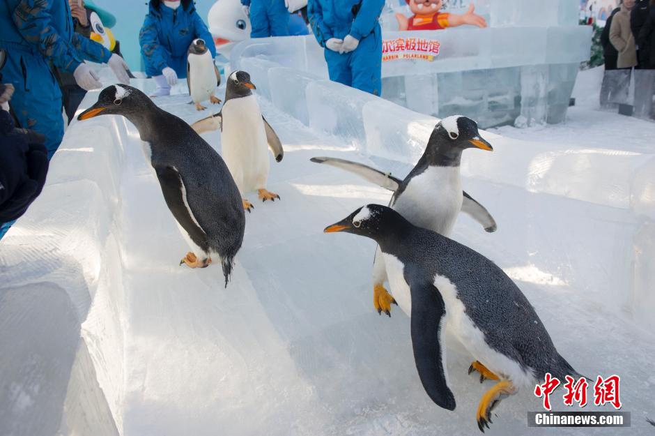 1月20日,哈尔滨出现极寒天气,哈尔滨极地馆内生活的8只南极企鹅走出户外。图为企鹅户外玩冰滑梯。中新社记者 于琨 摄