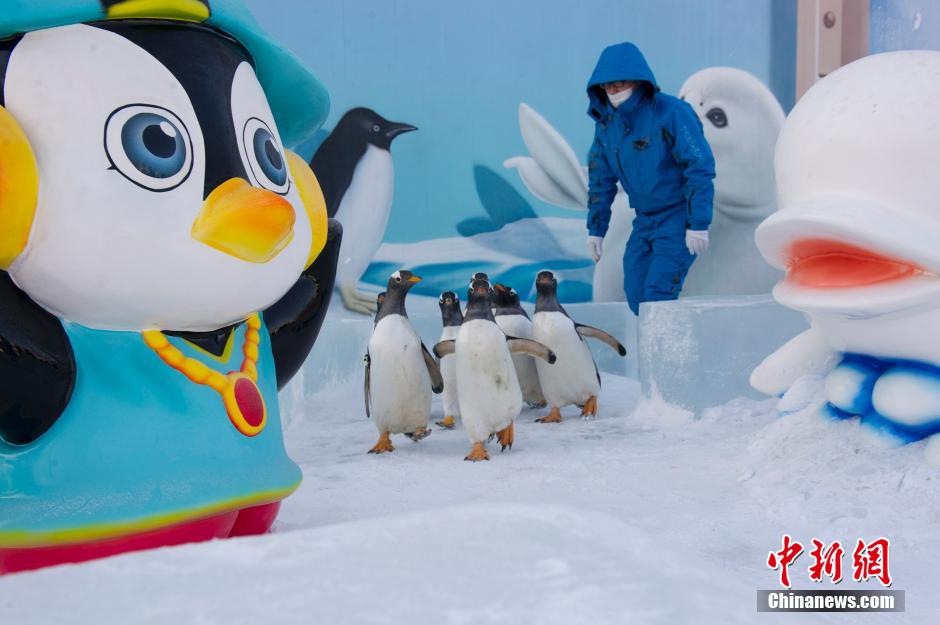 1月20日,哈尔滨出现极寒天气,哈尔滨极地馆内生活的8只南极企鹅走出户外。图为企鹅户外玩冰滑梯。中新社记者 于琨 摄
