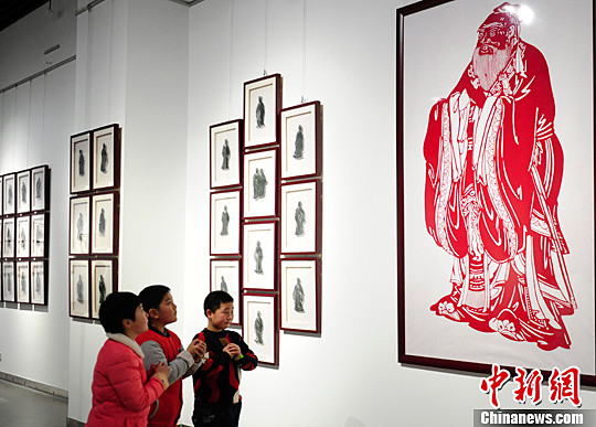 1月20日,中华非物质文化传承人卢雪创作的千余幅历史、神话故事剪纸作品在济南展出,“孔子”、“孙中山”、“女娲补天”等剪纸作品吸引许多民众前来参观欣赏。