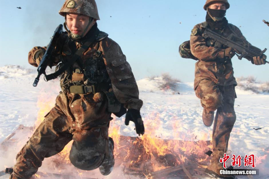 一八六团位于萨吾尔山北麓,紧靠玛依卡普奇卡依山,西南以乌勒昆乌拉斯图河为界与哈萨克斯坦接壤,边境线长达72公里,国家一类口岸吉木乃口岸就在团部,团部距新疆兵团第十师师部北屯有200公里。图为官兵跨越烈火。 郝胜忠 摄