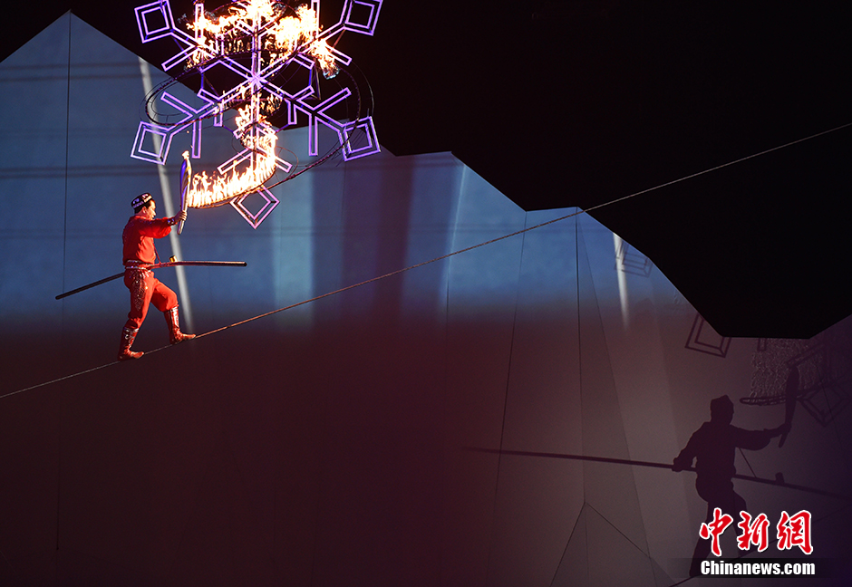 图为本届冬运会主火炬手阿迪力通过维吾尔传统体育项目“达瓦孜”在高空中点燃带有“冬”字的“雪花”,并引燃主火炬。 中新社记者 徐冬冬 摄