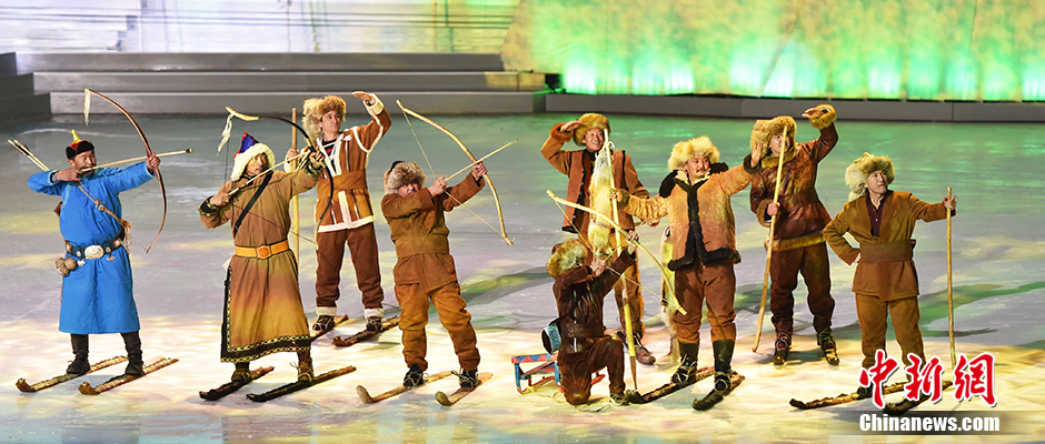 图为脚蹬毛皮滑雪板的演员,再现新疆阿勒泰原始滑雪狩猎的情景。 中新社记者 徐冬冬 摄