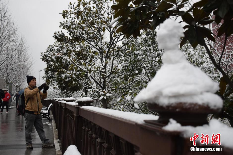 1月21日上午,武汉市民欣赏雪景。湖北入冬首场大范围雨雪天气20日拉开序幕。20日晚间,江城武汉飘起雪花,至21日上午部分地区已出现薄薄一层雪。这是入冬以来,武汉迎来的首场大范围降雪天气。 马芙蓉 摄