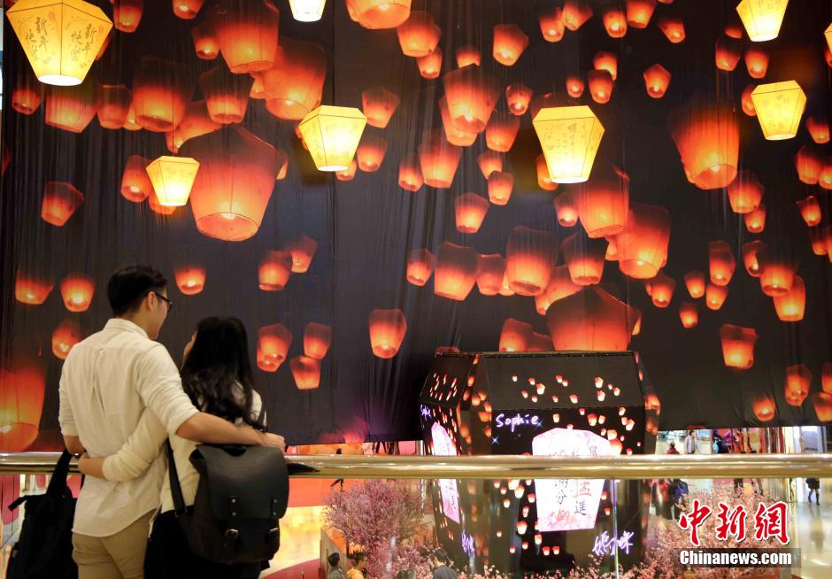 1月21日,香港市民在感受喜庆气氛。临近农历新年,香港太古城中心装饰孔明灯放飞美好心愿,与市民共度新春佳节。中新社记者 洪少葵 摄