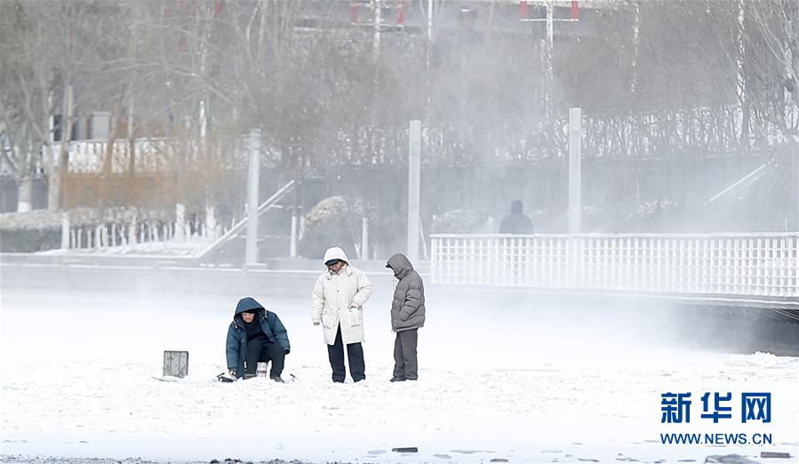 1月22日,天津市民穿着棉服在海河冰面上垂钓。当日,天津市区迎来降雪和降温天气。天津市气象台1月21日下午发布入冬以来首个寒潮预警,预计22日到24日天津将出现寒潮,降温幅度达8到10摄氏度,并有偏北风5-6级、阵风8级。新华社记者 岳月伟 摄