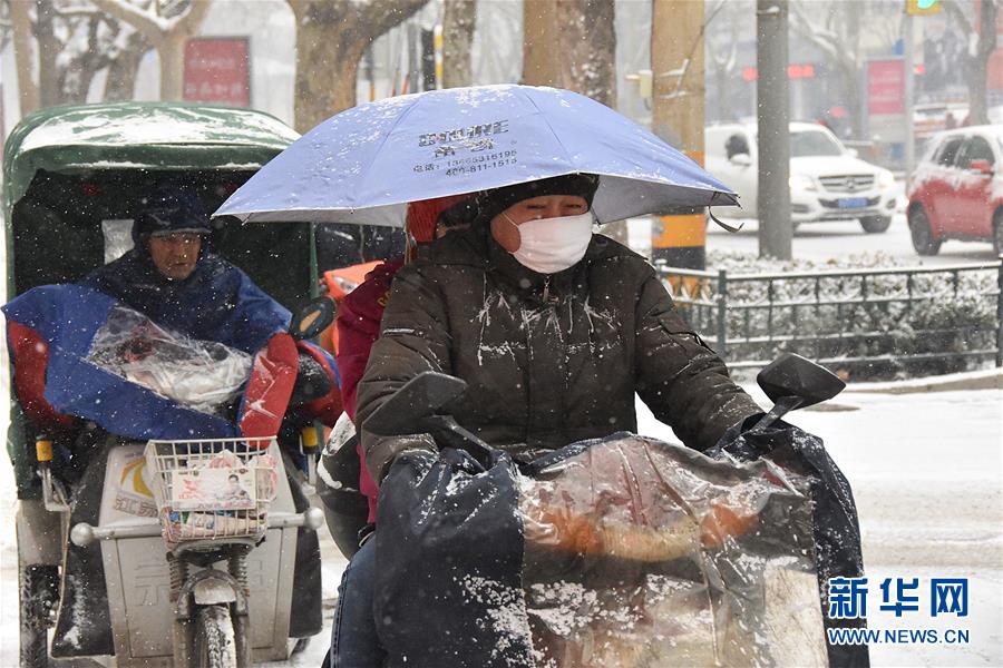 1月22日,市民冒雪行驶在济南市解放路上。当日,受强冷空气影响,济南市区出现降雪强降温天气,济南市气象部门已经发布低温和路面结冰预警,提醒市民注意防范。 新华社记者 冯杰 摄