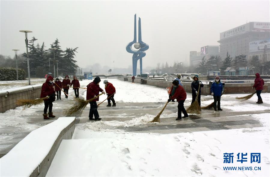 1月22日,市民在济南市泉城广场除雪。当日,受强冷空气影响,济南市区出现降雪强降温天气,济南市气象部门已经发布低温和路面结冰预警,提醒市民注意防范。 新华社记者 徐速绘 摄