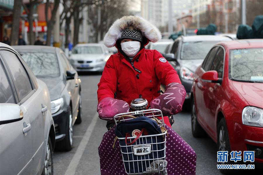 1月22日,市民“全副武装”地在北京街头骑车出行。据北京市气象台1月21日16时30分发布的寒潮黄色预警,受强冷空气影响,预计22至23日,北京市最低气温将下降10摄氏度左右,并伴有5、6级偏北风,阵风可达8级左右。新华社记者 沈伯韩 摄