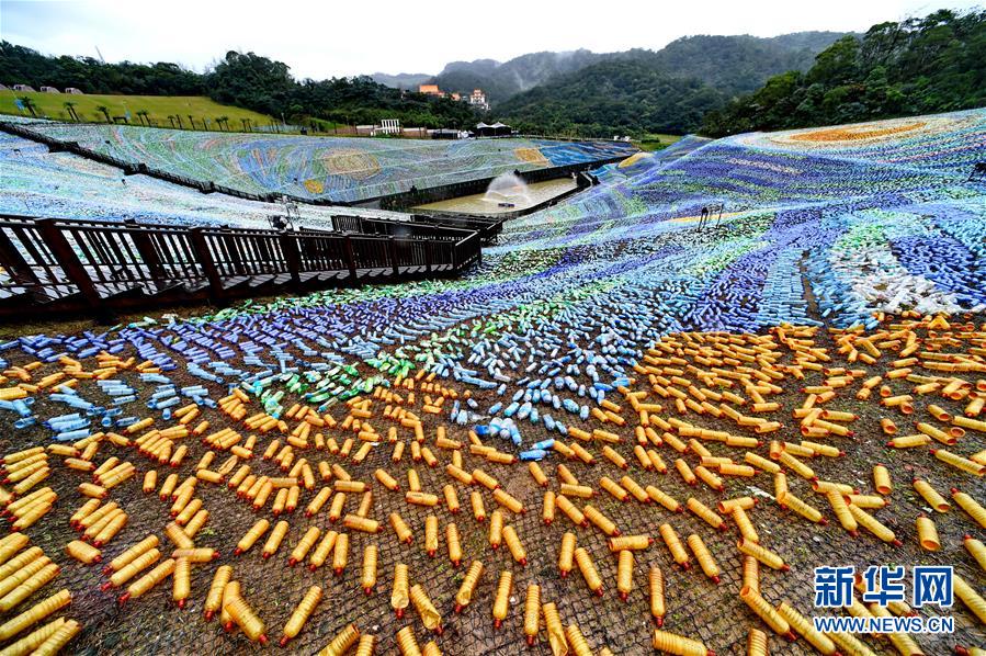 这是台湾基隆新建成的人造塑料“绿地”(1月22日摄)。当日,基隆“星空草原”景区内一块新建人造“绿地”正式对外开放。这块占地面积为6公顷的人造“绿地”使用4万只废塑料瓶摆放而成,以此呼吁保护环境。新华社记者 张国俊 摄