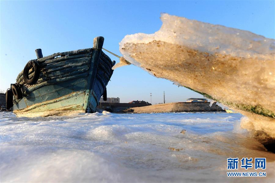 1月25日,山东青岛胶州湾,渔船被海冰冻结在海面上。受寒潮影响,山东青岛胶州湾北部冰情进一步加重,胶州湾跨海大桥北侧被海冰冰封,大桥南侧海冰延伸数公里。 新华社发(俞方平 摄)