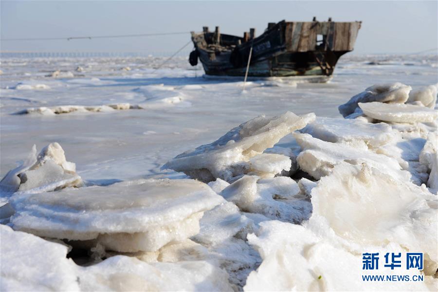 1月25日,山东青岛胶州湾,渔船被海冰冻结在海面上。受寒潮影响,山东青岛胶州湾北部冰情进一步加重,胶州湾跨海大桥北侧被海冰冰封,大桥南侧海冰延伸数公里。 新华社发(俞方平 摄)