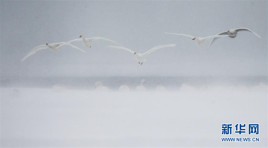 1月24日,在山东荣成天鹅湖,一群大天鹅在冰冻的湖面上飞翔。连日来,寒潮侵袭山东半岛,荣成天鹅湖区大面积被冰雪覆盖。 新华社发(王福东 摄)