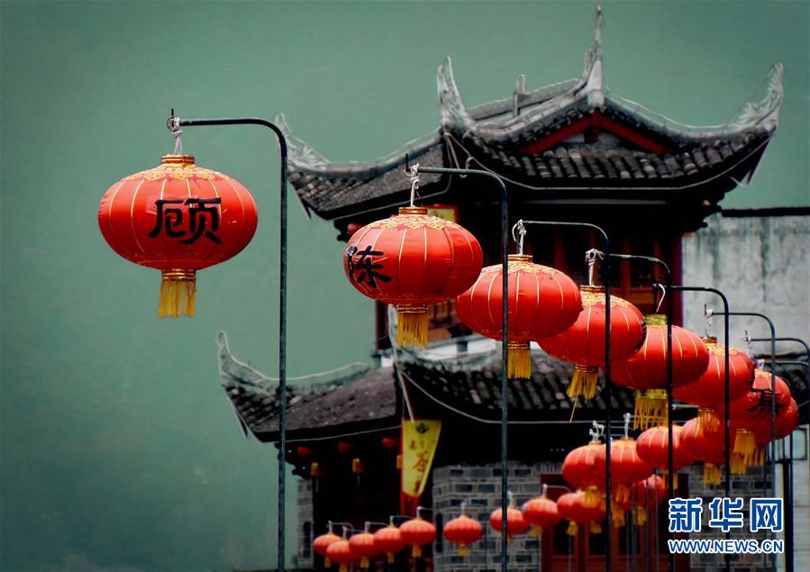 福建省长汀县的古城墙上,悬挂着展示中国姓氏文化的灯笼(2015年12月3日摄)。 新华社记者 王颂 摄