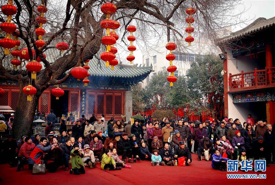 郑州市的城隍庙会上,市民们在挂满灯笼的院内观看演出(2011年2月6日摄)。新华社记者 王颂 摄