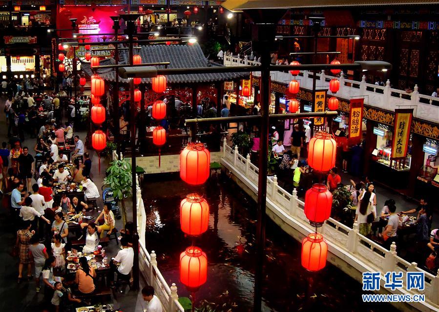 河南省开封市的小宋城美食街灯火通明,热闹非凡(2015年7月25日摄)。 新华社记者 王颂 摄