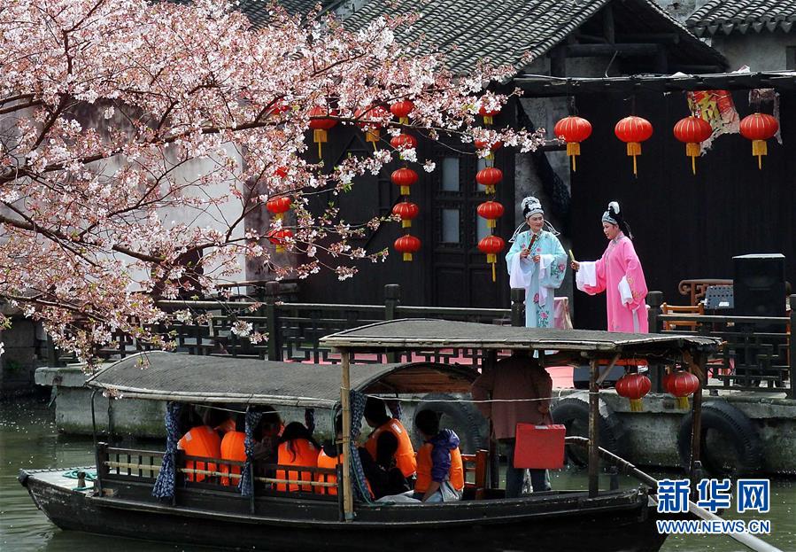 浙江省嘉善县西塘古镇,演员在河道旁的露天舞台为游客演唱传统越剧(2013年3月31日摄)。 新华社记者 王颂 摄