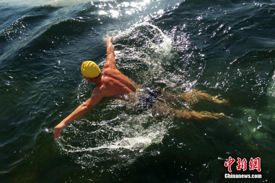 1月25日,市民在水中冬泳。当日,北京气温回升,市民到什刹海享受冬泳乐趣。 中新社记者 韩海丹 摄