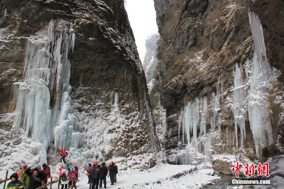 连日来,南方气温陡降,四川山区滴水成冰。大熊猫故乡——四川平武的冰瀑奇观吸引了众多游人慕名观赏。图为当地虎牙大峡谷的冰瀑景色。 中新社记者 杨超 摄