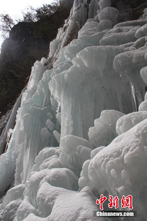 连日来,南方气温陡降,四川山区滴水成冰。大熊猫故乡——四川平武的冰瀑奇观吸引了众多游人慕名观赏。图为当地虎牙大峡谷的冰瀑景色。 中新社记者 杨超 摄