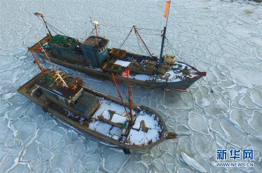 受寒潮影响,山东烟台海域的一些渔船码头被海冰封冻。