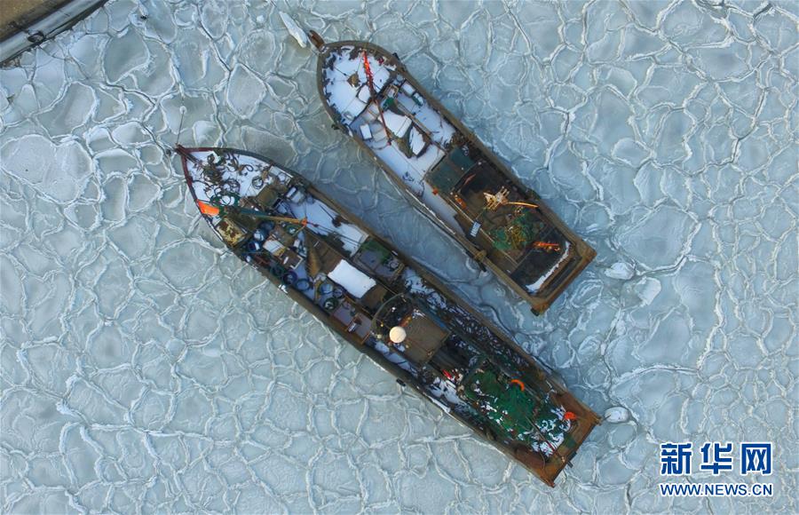 受寒潮影响,山东烟台海域的一些渔船码头被海冰封冻。