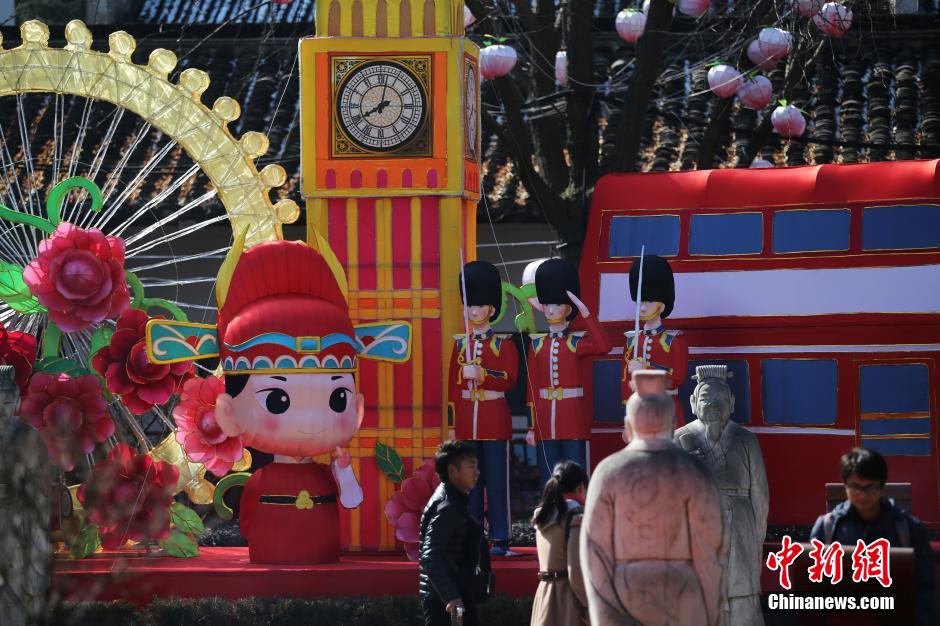 1月26日,南京夫子庙大成殿内,游客从刚刚安装好的大型彩灯前经过。随着春节临近,民间灯彩艺人开始在夫子庙一带加紧安装大型灯组、扎制各式花灯,为节日“盛装打扮”。中新社记者 泱波 摄