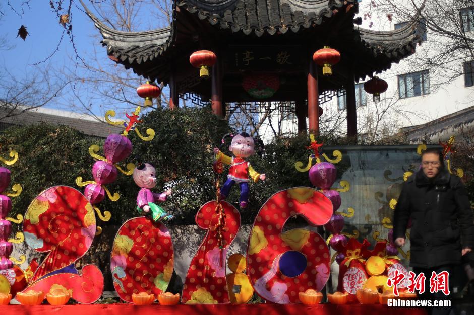 1月26日,南京夫子庙大成殿内,游客从刚刚安装好的大型彩灯前经过。随着春节临近,民间灯彩艺人开始在夫子庙一带加紧安装大型灯组、扎制各式花灯,为节日“盛装打扮”。中新社记者 泱波 摄