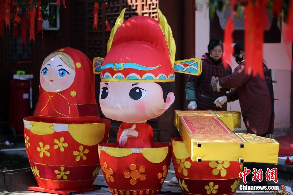 1月26日,南京夫子庙大成殿内,游客从刚刚安装好的大型彩灯前经过。随着春节临近,民间灯彩艺人开始在夫子庙一带加紧安装大型灯组、扎制各式花灯,为节日“盛装打扮”。中新社记者 泱波 摄